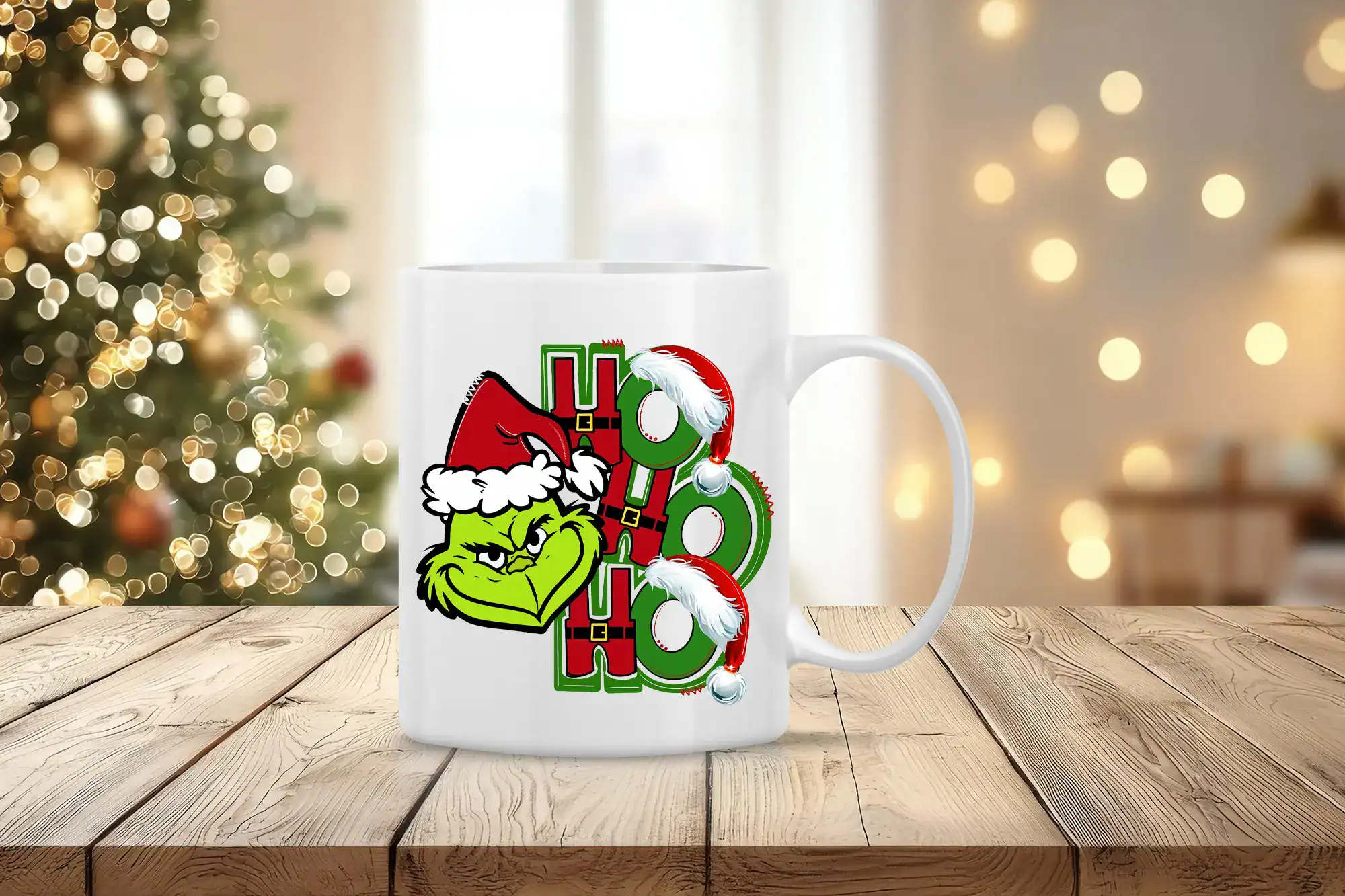 Humoros Grincs Ho Ho Ho bögre karácsonyi mintával. 3 dl-es kerámia bögre szublimációs nyomtatással – élénk színek, tartós minőség, tökéletes ajándék az ünnepekre!