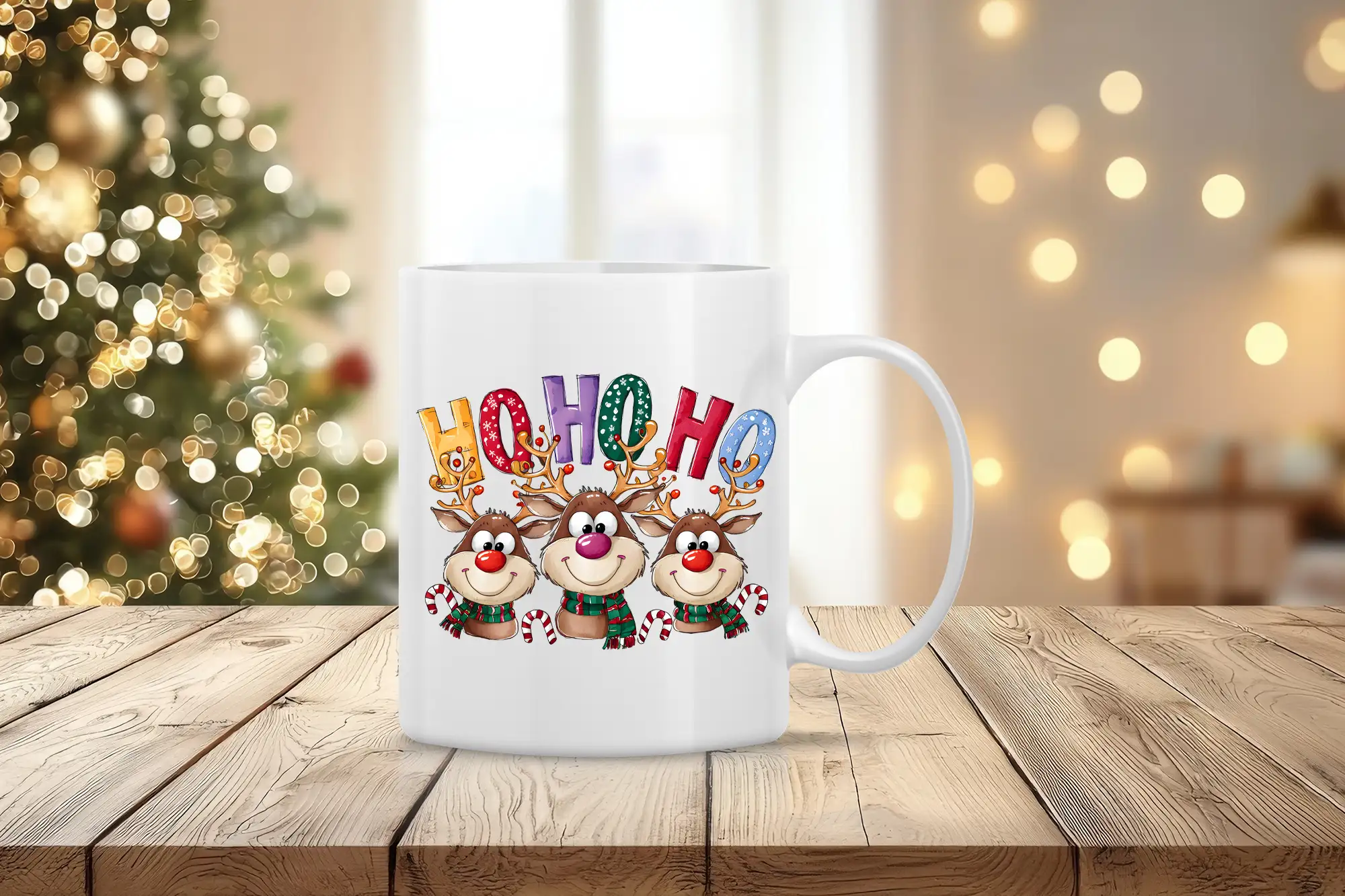 Vidám Ho Ho Ho rénszarvasos karácsonyi bögre, 3 dl-es kerámiából. Szublimációs nyomtatással készült élénk, tartós mintával – tökéletes karácsonyi ajándék kávé, tea vagy forró csoki mellé! 🎁