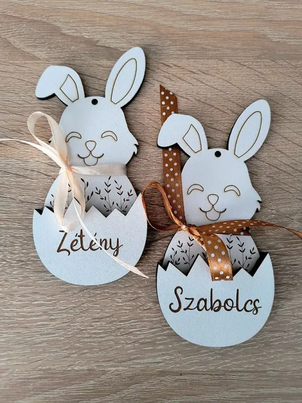 A nyuszi formájú dísz 3 mm vastag HDF anyagból készül, precíz lézervágással és gravírozással, így minden apró részlet szépen kidolgozott. A természetes hatású, fehér színű felületet finom minták és aranyos nyuszi arc teszi még szerethetőbbé.