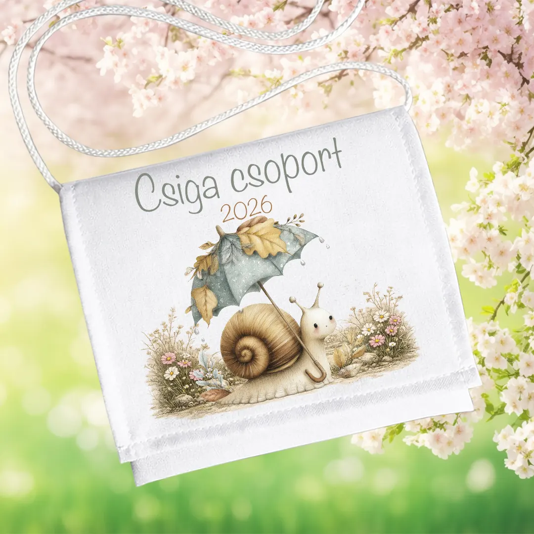 A visszafogott színvilág és a letisztult fehér alap harmonikus összképet alkot, így a tarisznya nem hivalkodó, mégis igazán különleges emlék az óvodai ballagás napjára. A „Csiga csoport” felirat elegáns betűtípussal, alatta a 2026-os évszám jelenik meg, jól olvasható és ízléses elrendezésben.
