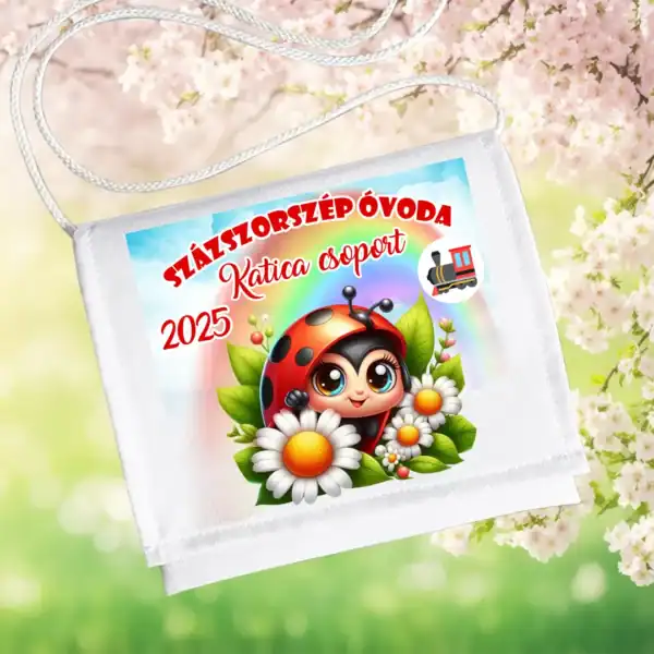 A Százszorszép Óvoda Katica csoportjának készült szivárványos, katica–százszorszép minta vidám, tavaszias hangulatot áraszt, amely tökéletesen illik az ünnepi alkalomhoz.
