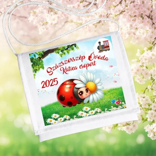 A Katica csoport számára készült százszorszépes, katica mintás grafika vidám, tavaszias hangulatot áraszt, amely tökéletesen illik az óvodai ballagás ünnepi pillanataihoz.