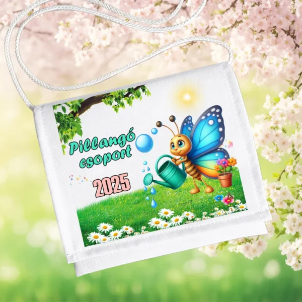 Ez az ovis ballagó tarisznya a Pillangó csoport ballagására készült, vidám és színes pillangós mintával. A locsolókannát tartó pillangó, a virágos rét és a napfényes hangulat igazi tavaszi, pozitív élményt sugároz, így tökéletes emlék az óvodai évek lezárásához.